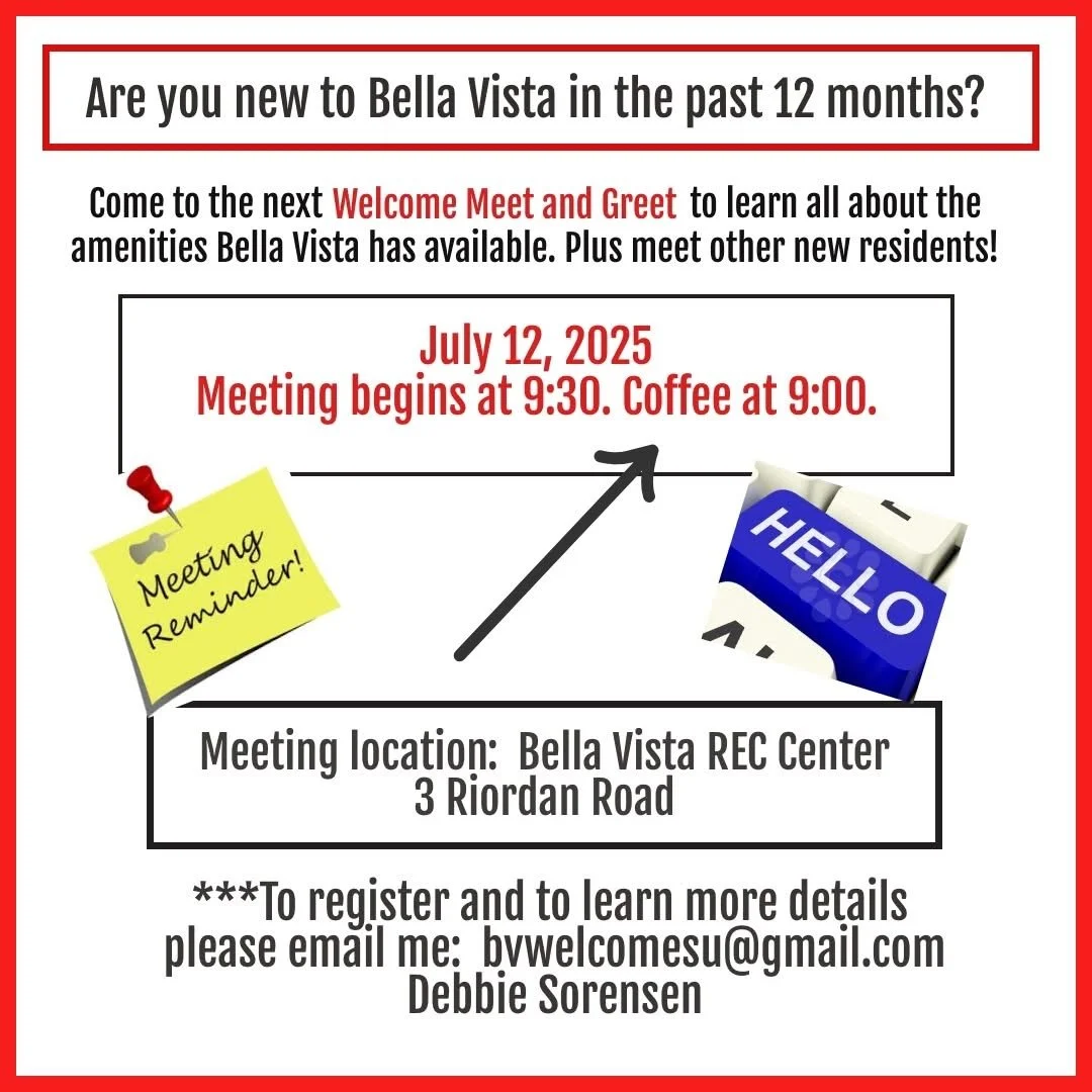 Jul 12 Welcome Meet and Greet for New Residents Saturday, July 12, 2025 9:00 AM 11:00 AM Bella Vista REC Center (map) Google Calendar ICS View Event →